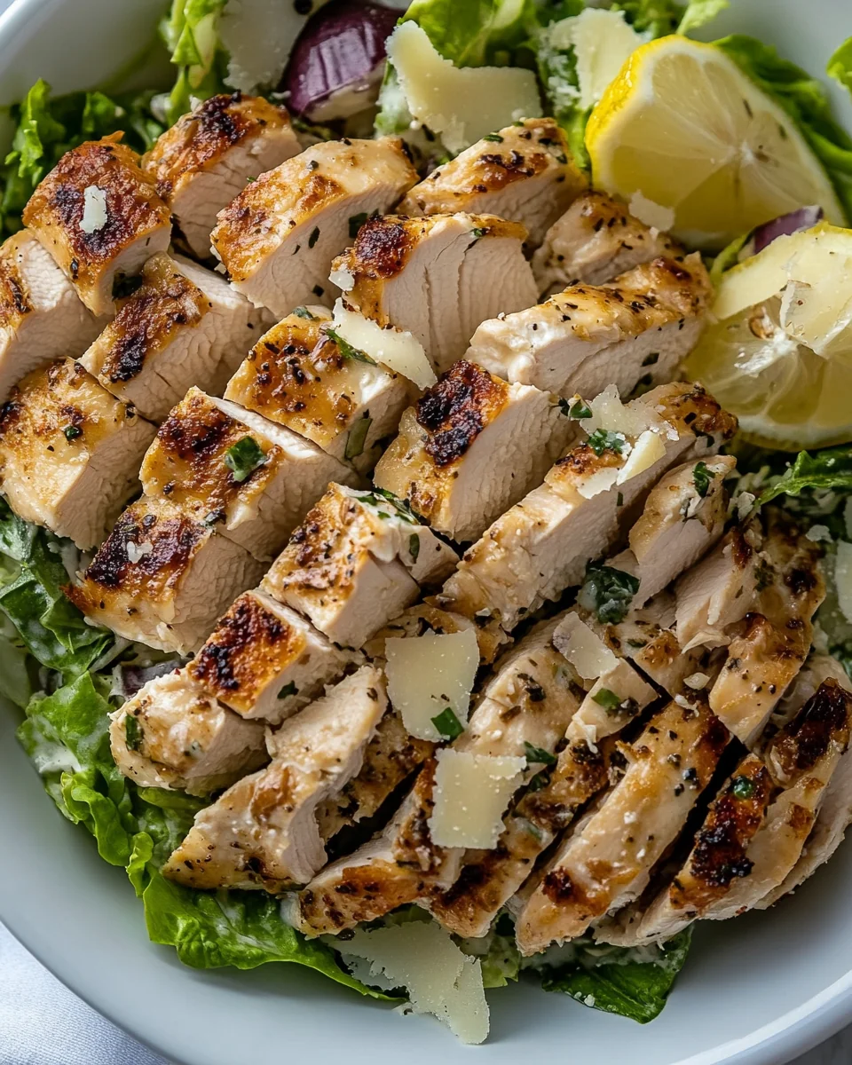 - Add the sliced chicken and Parmesan cheese to the salad and toss until well combined.
