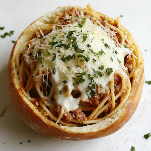 Homemade Spaghetti in a Crispy Bread Bowl is a culinary masterpiece that combines the robust flavor of traditional spaghetti with the delightful crunch of a freshly baked bread bowl. This dish appeals to families and foodies alike, making it perfect for cozy weeknight dinners or festive gatherings. The contrast of the soft, savory spaghetti against the crisp texture of the bread creates a unique dining experience that is both satisfying and visually appealing. Serve this dish at your next gathering, and watch as it quickly becomes a favorite, with everyone eagerly digging into their edible bowls!