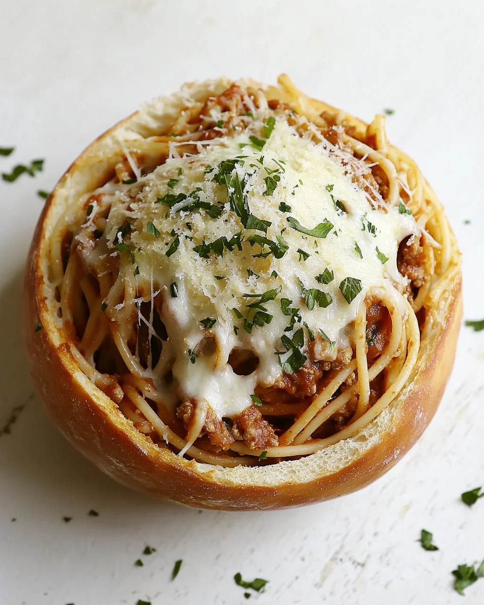 - Top each filled bread bowl with additional Parmesan cheese and a sprinkle of fresh herbs if desired. Serve immediately while the bread is still crispy and the spaghetti is warm. Enjoy your Homemade Spaghetti in a Crispy Bread Bowl!