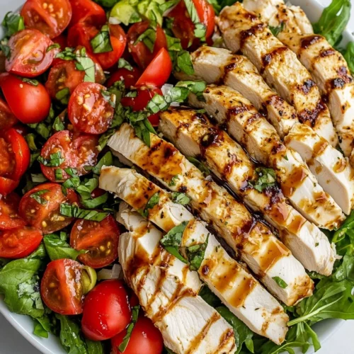 - Assemble the salad by layering sliced tomatoes, mozzarella, and grilled chicken on a serving platter.