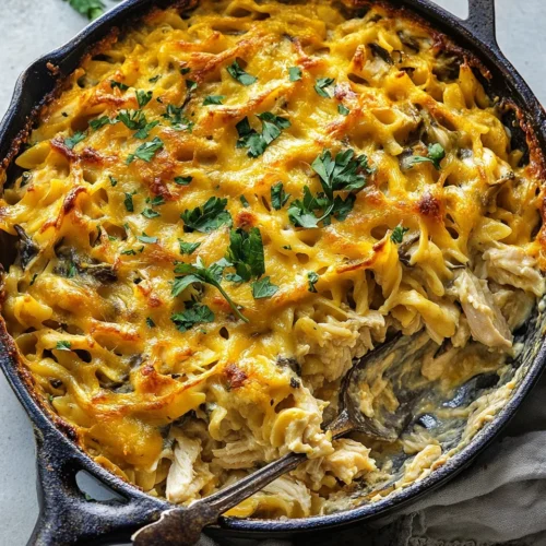 The Simple Skillet Chicken Noodle Casserole is a comforting dish that brings warmth to any table, making it an ideal choice for busy weeknight dinners or family gatherings. This delightful casserole combines tender chicken, perfectly cooked noodles, and a creamy sauce that tantalizes the taste buds. The rich flavors meld beautifully, creating a satisfying meal that even the pickiest eaters will love. Its simplicity and quick preparation make it a go-to recipe for those looking for a hassle-free yet delicious option. Perfect for families, this dish can be easily scaled up or down, ensuring everyone gets a generous helping. Whether you’re serving it on a chilly evening or for a casual family get-together, the Simple Skillet Chicken Noodle Casserole is sure to impress.