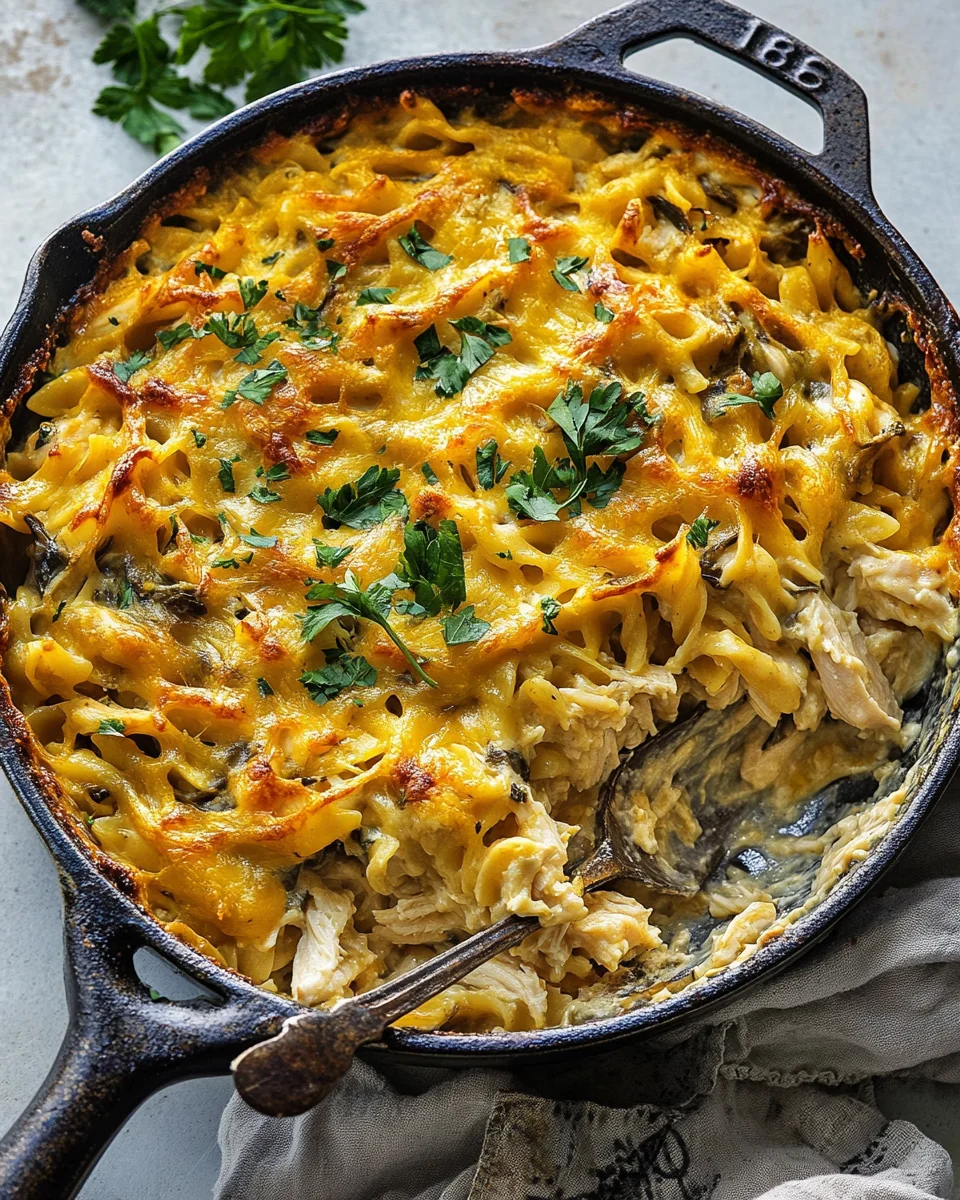 The Simple Skillet Chicken Noodle Casserole is a comforting dish that brings warmth to any table, making it an ideal choice for busy weeknight dinners or family gatherings. This delightful casserole combines tender chicken, perfectly cooked noodles, and a creamy sauce that tantalizes the taste buds. The rich flavors meld beautifully, creating a satisfying meal that even the pickiest eaters will love. Its simplicity and quick preparation make it a go-to recipe for those looking for a hassle-free yet delicious option. Perfect for families, this dish can be easily scaled up or down, ensuring everyone gets a generous helping. Whether you’re serving it on a chilly evening or for a casual family get-together, the Simple Skillet Chicken Noodle Casserole is sure to impress.